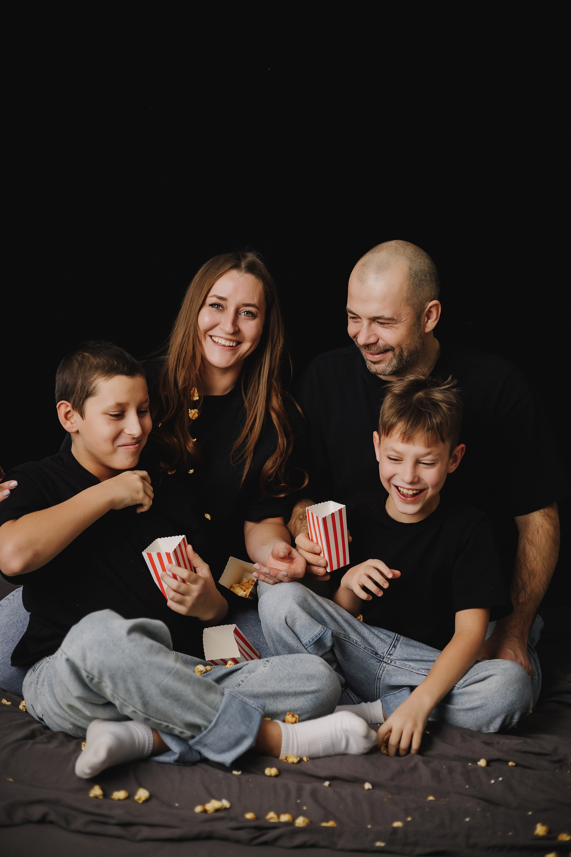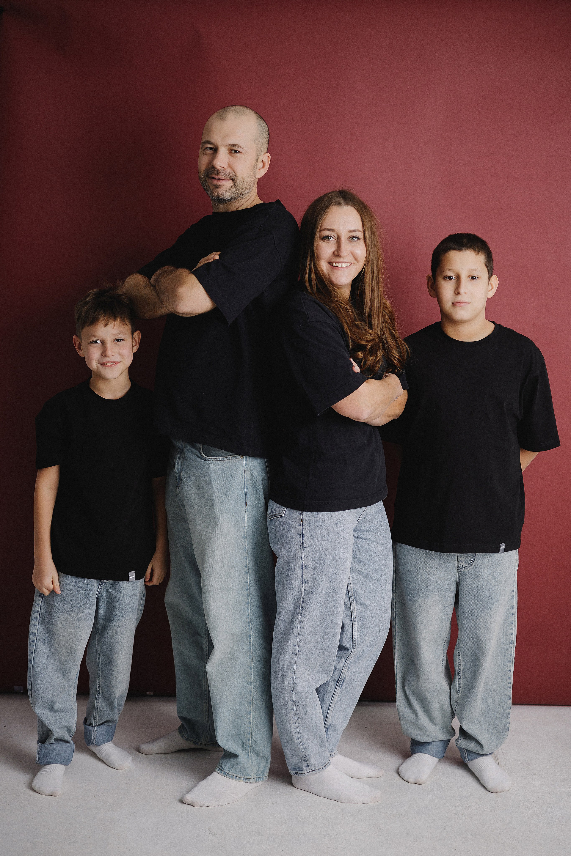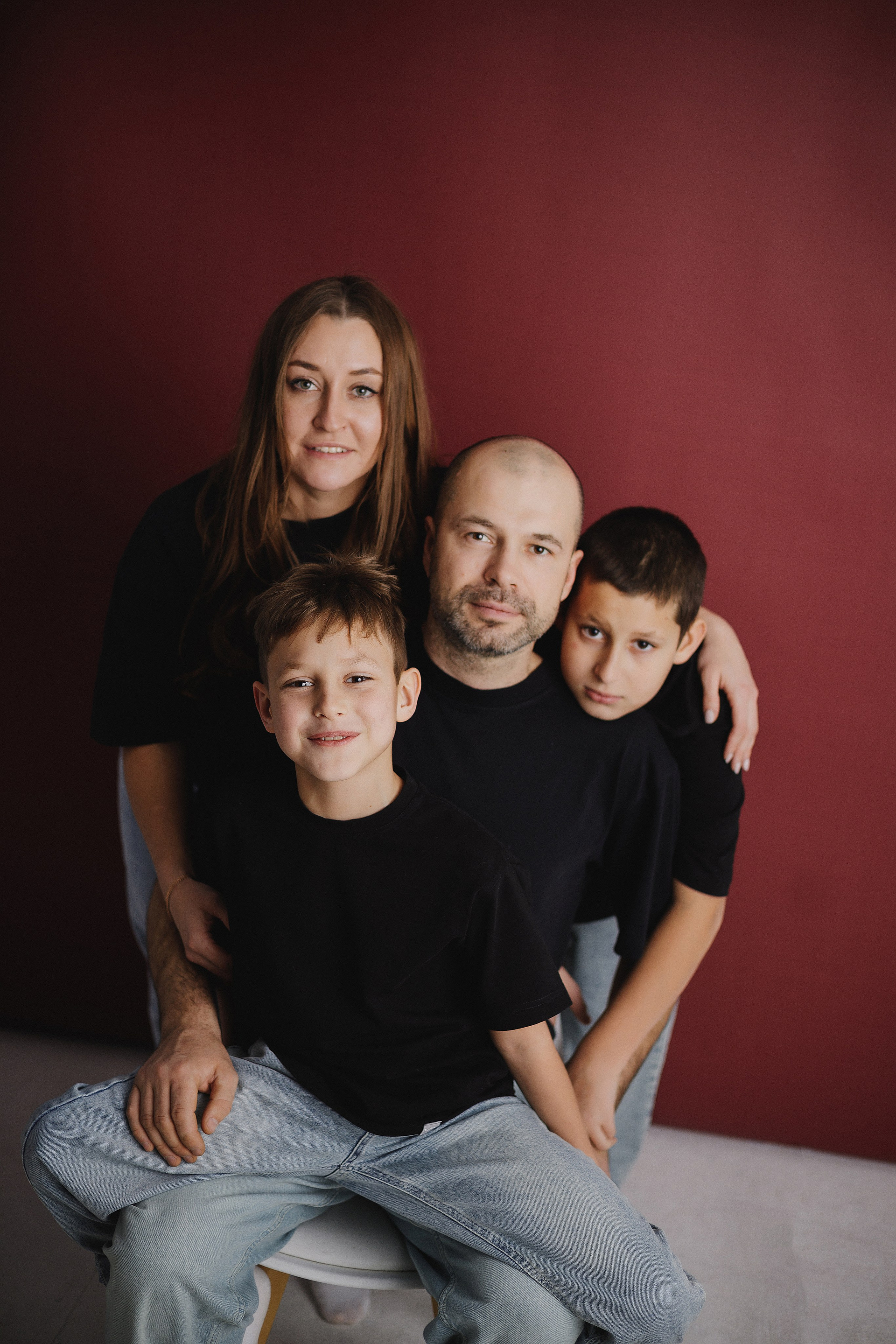 Фотография мамы, папы и двух сыновей в фотостудии